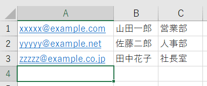 メールアドレスの右側のカラムに氏名などの情報を追加することにより、本文中に差し込みを行うことができます。