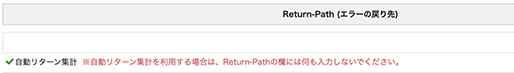 本文の設定画面の「Return-Path(エラーの戻り先)」の欄で、「自動リターン集計」にチェックをしてください。Return-Path にシステムの設定した値が入り、リターンメールが自動的に処理されるようになります。